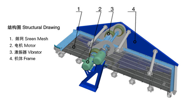主要由篩箱、篩框、篩網(wǎng)、振動電機、電機臺座、減振彈簧、支架等組成。