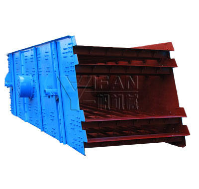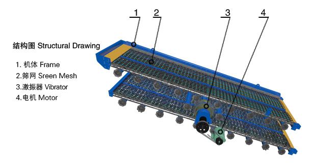 電動機經(jīng)三角帶使激振器偏心塊產(chǎn)生高速旋轉。運轉的偏心塊產(chǎn)生很大的離心力,激發(fā)篩箱產(chǎn)生一定振幅的圓運動,篩上物料在傾斜的篩面上受到篩箱傳給的沖量而產(chǎn)生連續(xù)的拋擲運動,物料與篩面相遇的過程中使小于篩孔的顆粒透篩,從而實現(xiàn)分級。