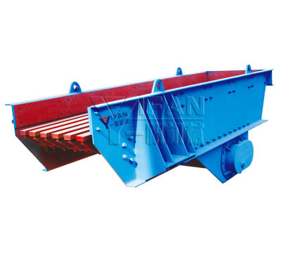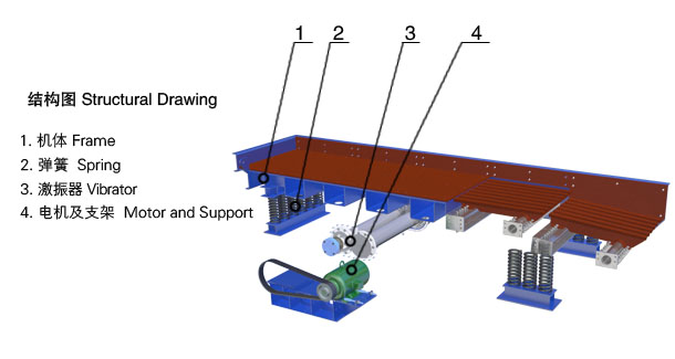 ZSW系列振動(dòng)給料機(jī)是由給料槽體、激振器、彈簧支座、傳動(dòng)裝置等組成。槽體振動(dòng)給料的振動(dòng)源是激振器,激振器是由兩根偏心軸(主、被動(dòng))和齒輪副組成,由電動(dòng)機(jī)通過三角帶驅(qū)動(dòng)主動(dòng)軸,再由主動(dòng)軸上齒輪嚙合被動(dòng)軸轉(zhuǎn)動(dòng),主、被動(dòng)軸同時(shí)反向旋轉(zhuǎn),槽體振動(dòng),使物料連續(xù)不斷流動(dòng),達(dá)到輸送物料的目的。