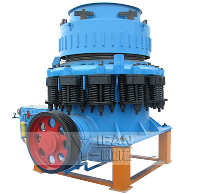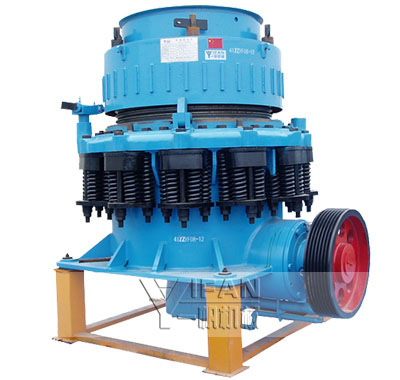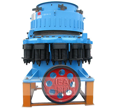 彈簧圓錐破碎機(jī)工作時(shí),由電動(dòng)機(jī)通過三角帶、大帶輪、傳動(dòng)軸、小錐齒輪、大錐齒輪帶動(dòng)偏心套旋轉(zhuǎn),破碎圓錐軸心線在偏心軸套的迫動(dòng)下做旋轉(zhuǎn)擺動(dòng),使得破碎壁表面時(shí)而靠近又時(shí)而離開軋臼壁的表面,從而使物料在定錐與動(dòng)錐組成的環(huán)形破碎腔內(nèi)不斷地受到?jīng)_擊、擠壓和彎曲而破碎。經(jīng)過多次擠壓、沖擊和彎曲后,物料破碎至要求粒度,經(jīng)下部排出。 廣泛應(yīng)用于冶金、建筑、水電、交通、化工、建材工業(yè)中, 適合破碎堅(jiān)硬、中等硬度以上的各種礦石和巖石。