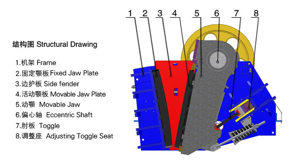 電動(dòng)機(jī)驅(qū)動(dòng)皮帶和皮帶輪,通過偏心軸使動(dòng)鄂前后上下擺動(dòng),當(dāng)動(dòng)鄂推動(dòng)動(dòng)鄂板向定鄂板運(yùn)動(dòng)時(shí),物料被壓 碎或劈碎。當(dāng)動(dòng)鄂和動(dòng)鄂板在偏心軸、彈簧的作用下后退時(shí),先前已被壓碎或劈碎的物料從鄂板的下部排料口排出。隨著電動(dòng)機(jī)連續(xù)轉(zhuǎn)動(dòng)而破碎機(jī)動(dòng)鄂作周期性地壓 碎和排泄物料,實(shí)現(xiàn)批量生產(chǎn)。