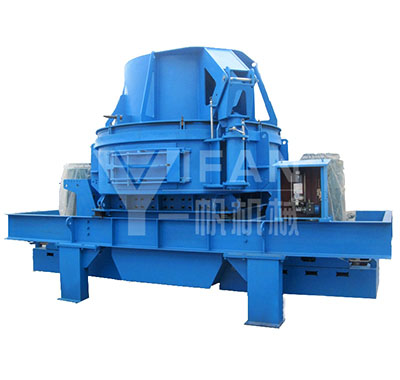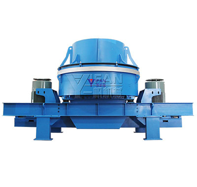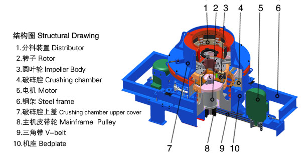 物料由機(jī)器上部垂直落入高速旋轉(zhuǎn)的葉輪內(nèi),在高速離心力的作用下,與另一部分以傘狀形式分流在葉輪四周的物料產(chǎn)生高速撞擊與粉碎,物料在互相撞擊后,又會(huì)在葉輪和機(jī)殼之間以物料形成渦流多次的互相撞擊、摩擦而粉碎,從下部直通排出,形成閉路多次循環(huán),由篩分設(shè)備控制達(dá)到所要求的成品粒度。