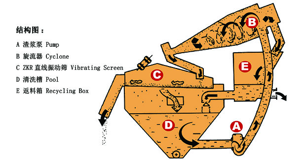 1、細(xì)砂回收系統(tǒng)結(jié)構(gòu):由電機(jī)、渣漿泵、旋流器、ZKR直線振動(dòng)篩、清洗槽、返料箱等組成。