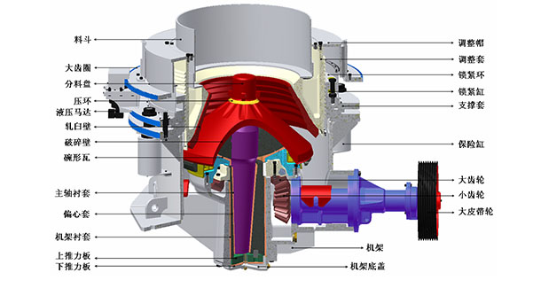 CCH系列液壓圓錐破碎機工作時,由電動機通過三角帶、主機帶輪、傳動軸、小錐齒輪、大錐齒輪帶動外銅旋轉,破碎圓錐軸心線在外銅的迫動下做旋轉擺動,使得破碎壁表面時而靠近又時而離開軋臼壁的表面,從而使物料在定錐與動錐組成的環(huán)形破碎腔內不斷地受到沖擊、擠壓和彎曲而破碎。經過多次擠壓、沖擊和彎曲后,物料破碎至要求粒度,經下部排出。