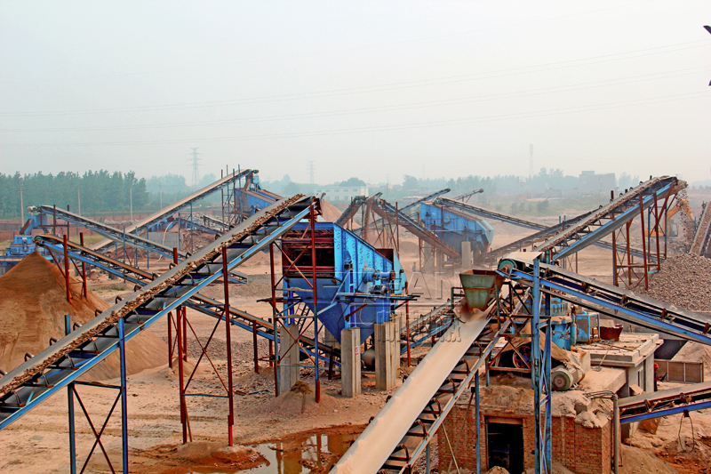 最后一條生產(chǎn)線是由皮帶機(jī)、兩臺(tái)立式破碎機(jī)、兩臺(tái)振動(dòng)篩、還有一臺(tái)洗砂機(jī)設(shè)備配合完成的一條生產(chǎn)線。
