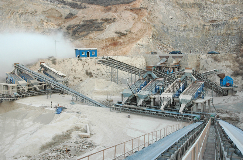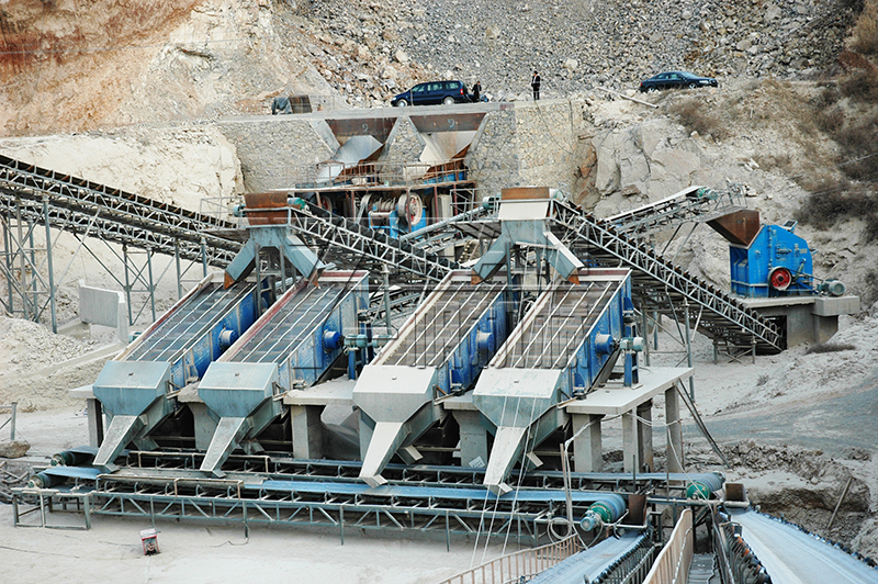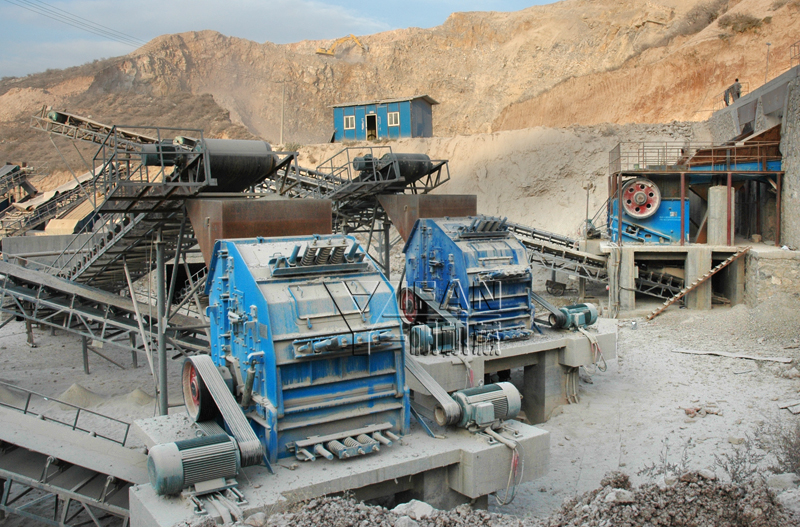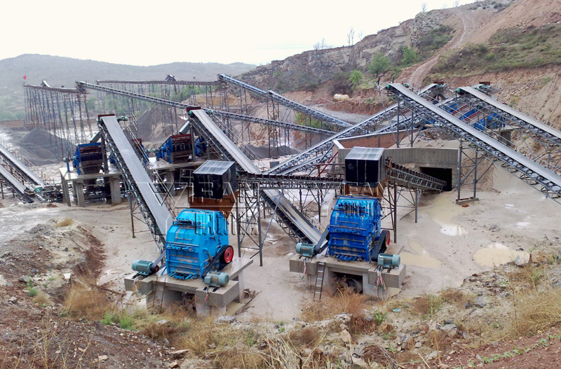 整個(gè)生產(chǎn)線由2臺(tái)顎破+2臺(tái)反擊破+6臺(tái)振動(dòng)篩組成。從礦山開(kāi)采后的石灰石先進(jìn)顎式破碎機(jī)進(jìn)行一破, 之后由膠帶輸送機(jī)運(yùn)至反擊式破碎機(jī)進(jìn)行二破,這樣破碎后的石灰石粒度相差懸殊, 小粒徑可在10毫米以下, 大粒徑可達(dá)30-40毫米, 粒度均勻。