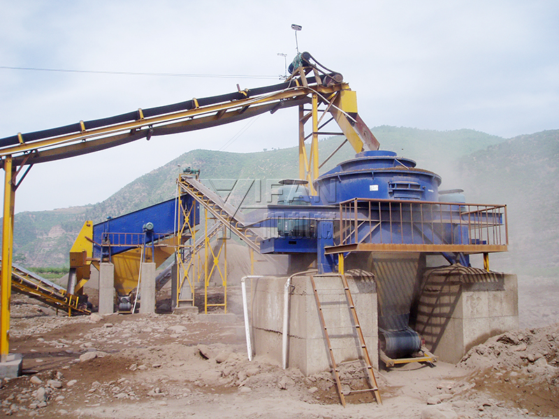 3、振動給料機(jī)+顎式破碎機(jī)+反擊式破碎機(jī)+沖擊式整形制砂機(jī)+皮帶輸送機(jī)+圓振動篩。