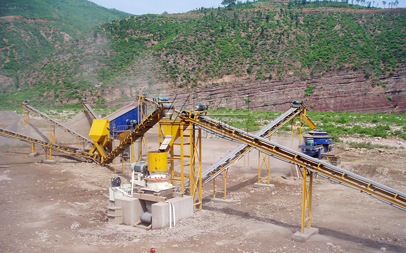 2、 振動給料機(jī)+顎式破碎機(jī)+圓錐式破碎機(jī)+皮帶輸送機(jī)、圓振動篩;
