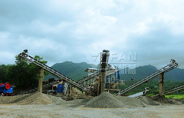 我國河卵石資源眾多,因地而異。因此在配置設備時,要把方案的耐磨性性放在第一位。粒度大的可參考花崗巖與玄武巖的破碎;粒度小的需進行預篩分,以降低生產成本; 以200mm以下河卵石為例:物料在原料倉經由給料機、皮帶機輸送至1#振動篩進行預篩分,大于40mm的物料進入圓錐破進行破碎,5-40mm的進入立式沖擊破碎機進行破碎,0-5mm的進入洗砂機清洗后直接出成品。圓錐破破碎后的產品上2#振動篩篩分,大于40mm的返回圓錐破重新破碎,形成閉路循環(huán),小于40mm的進入立式沖擊破破碎。立式沖擊破出來的料上3#振動篩篩分,大于20mm的返回立式沖擊破進行破碎,形成閉路循環(huán),小于20mm的物料經由皮帶機輸送至成品料堆,根據(jù)原料的潔凈程度可考慮將0-5mm的物料送至洗砂機清洗。